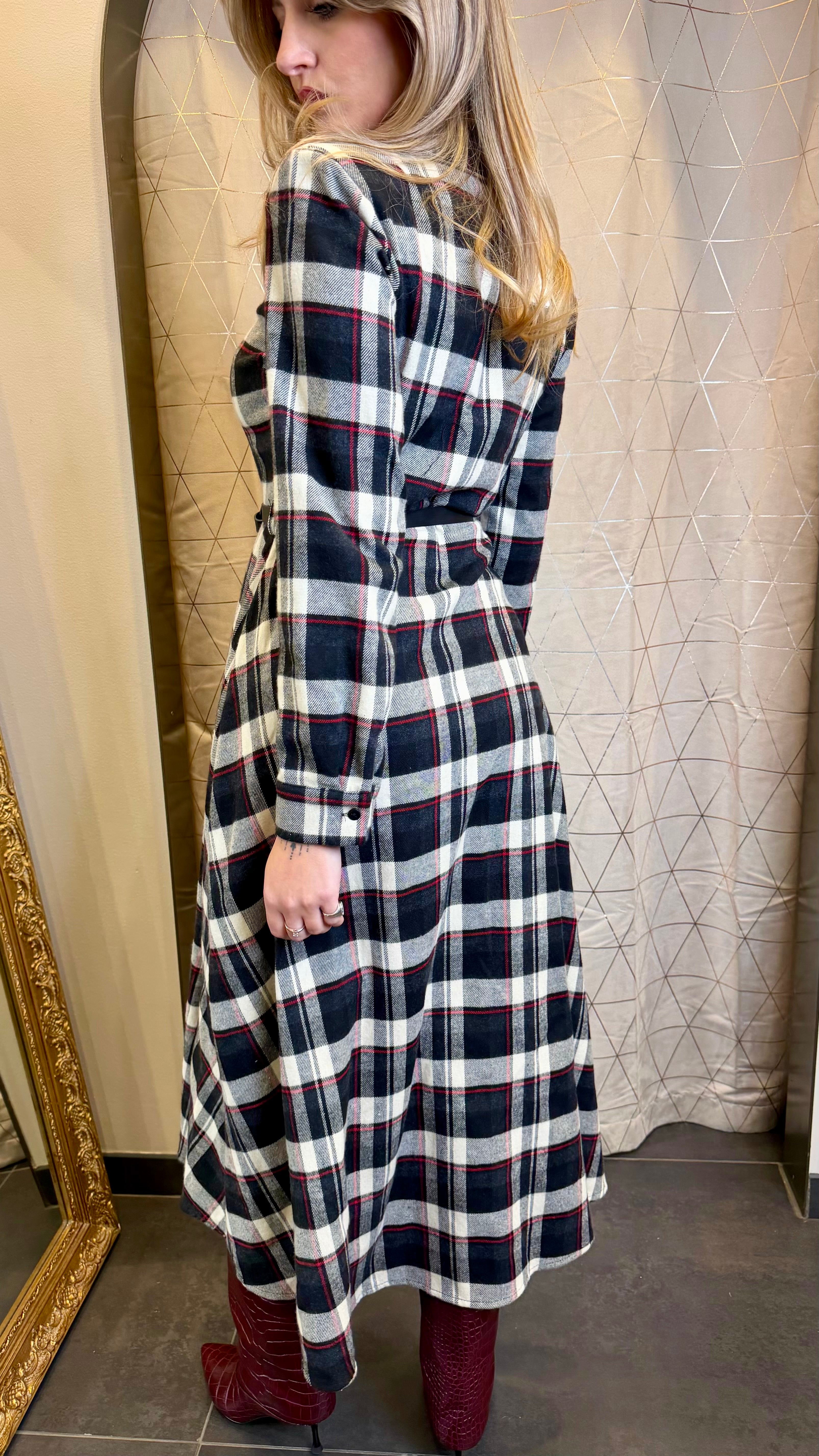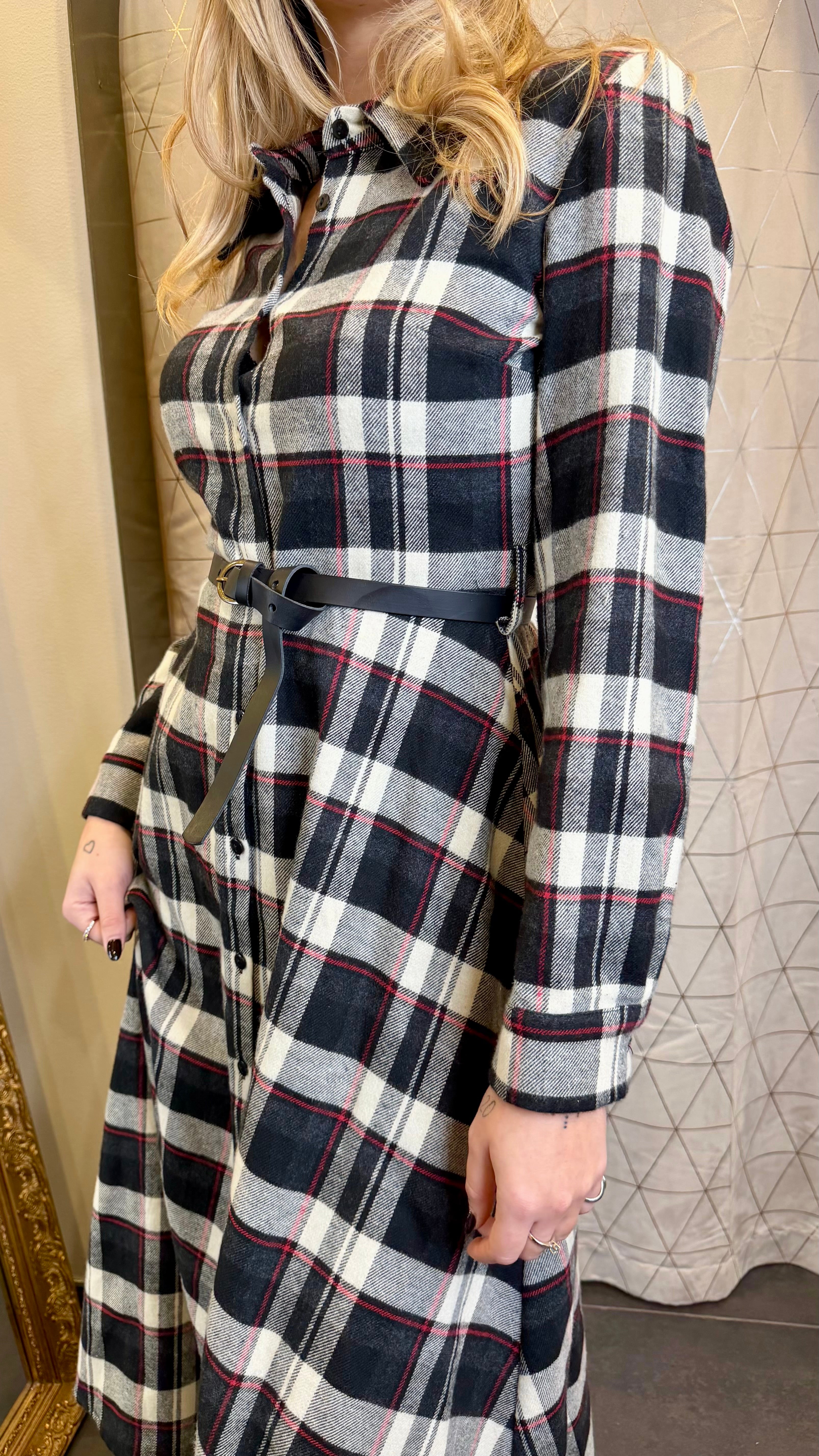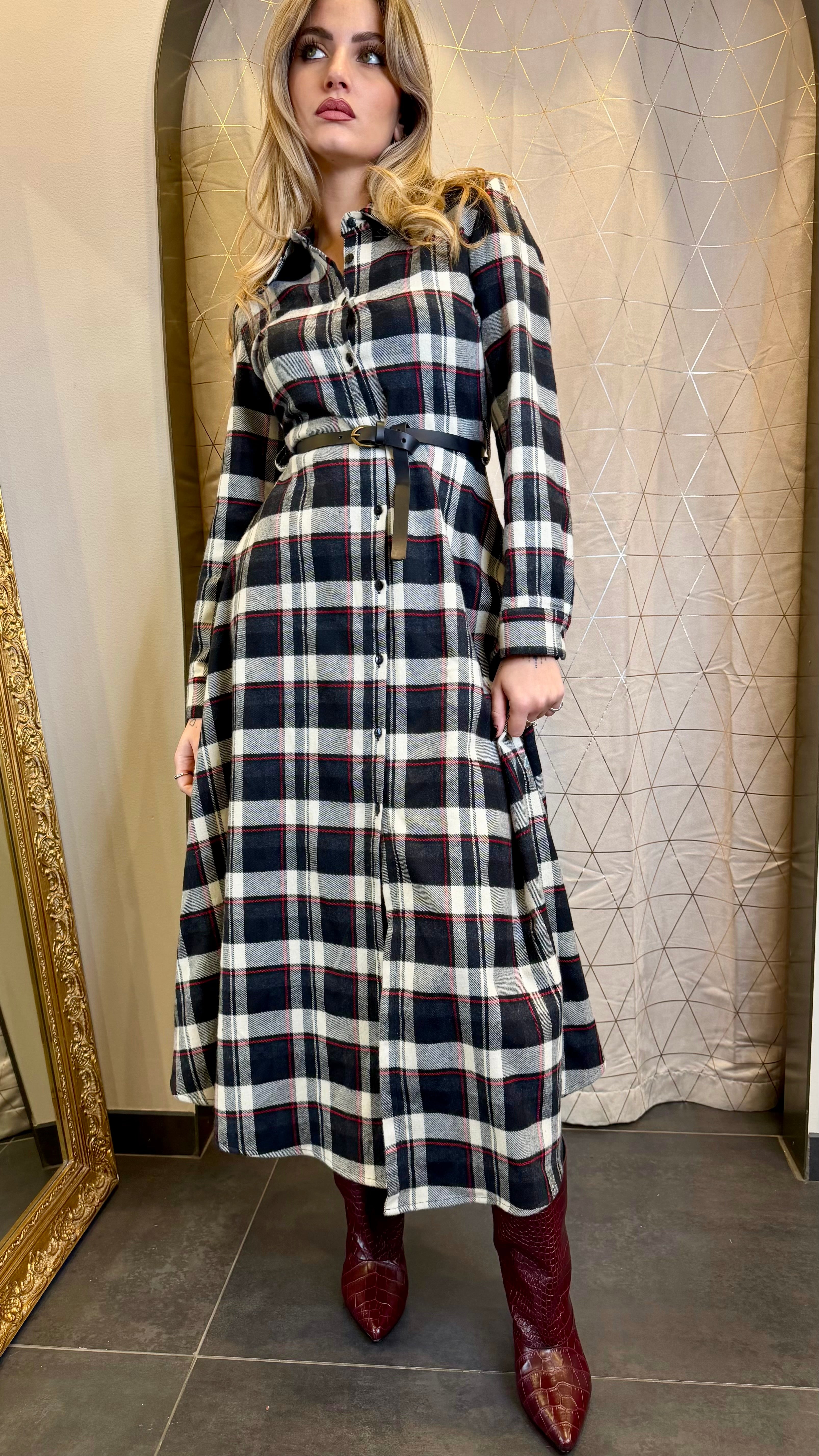 Abito camicia in fantasia check con spalline imbottite e cintura
