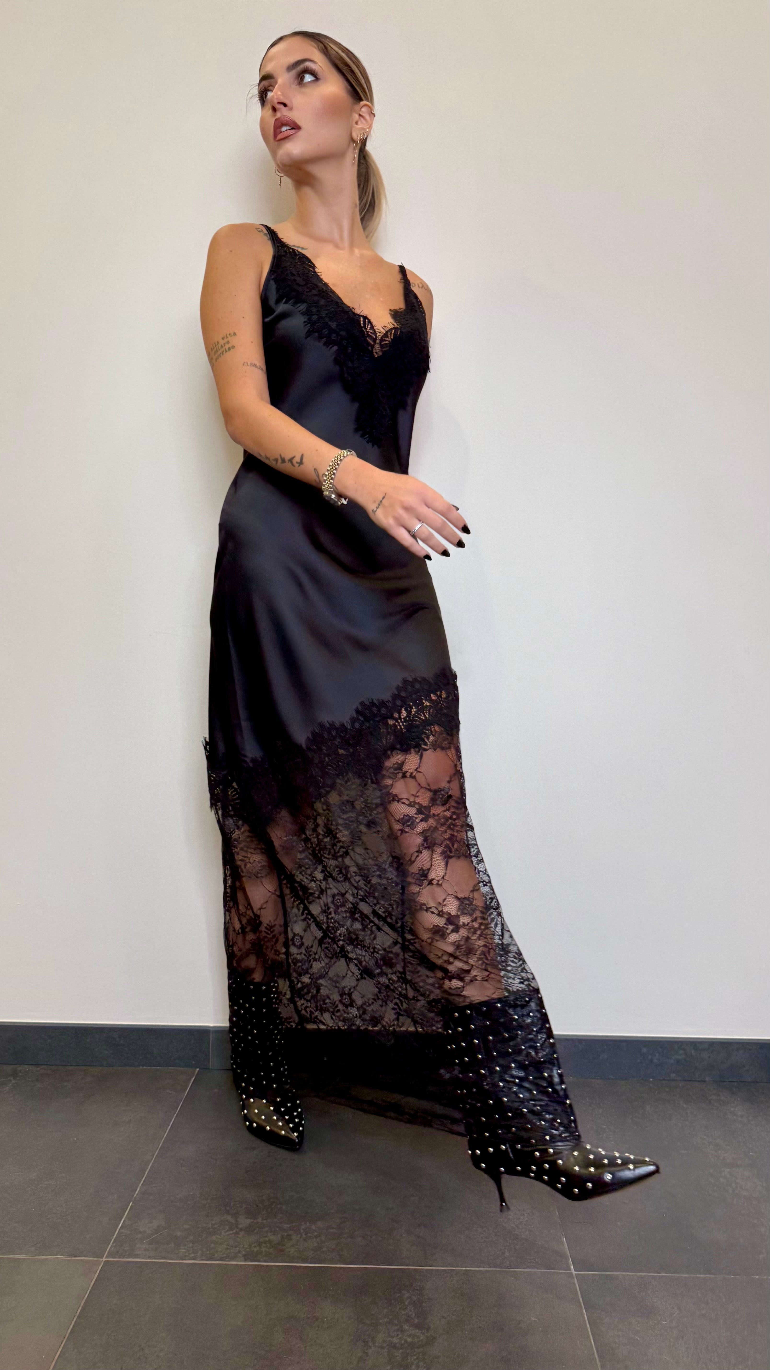 Abito in satin con pizzo al fondo e scollo a V
