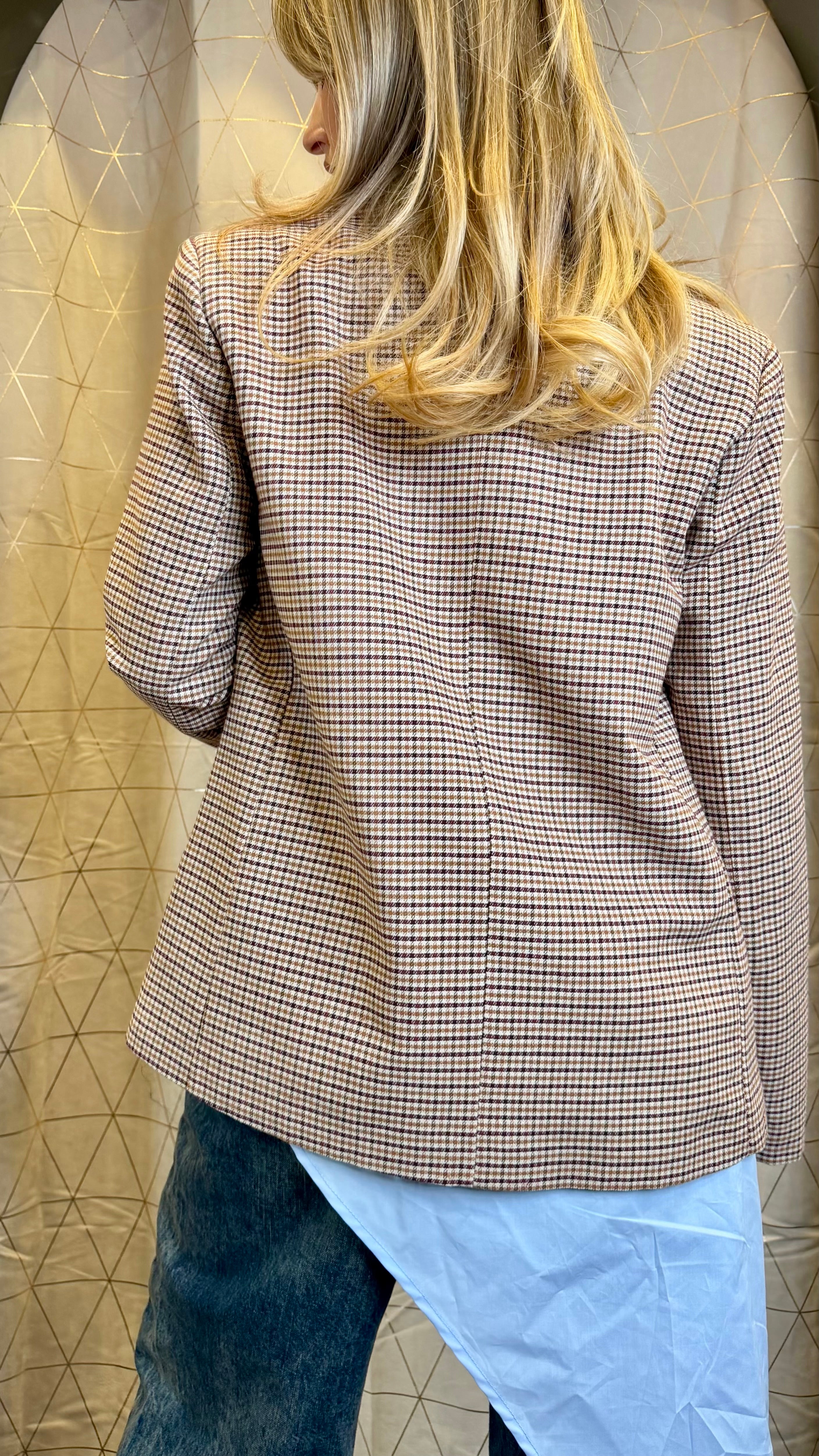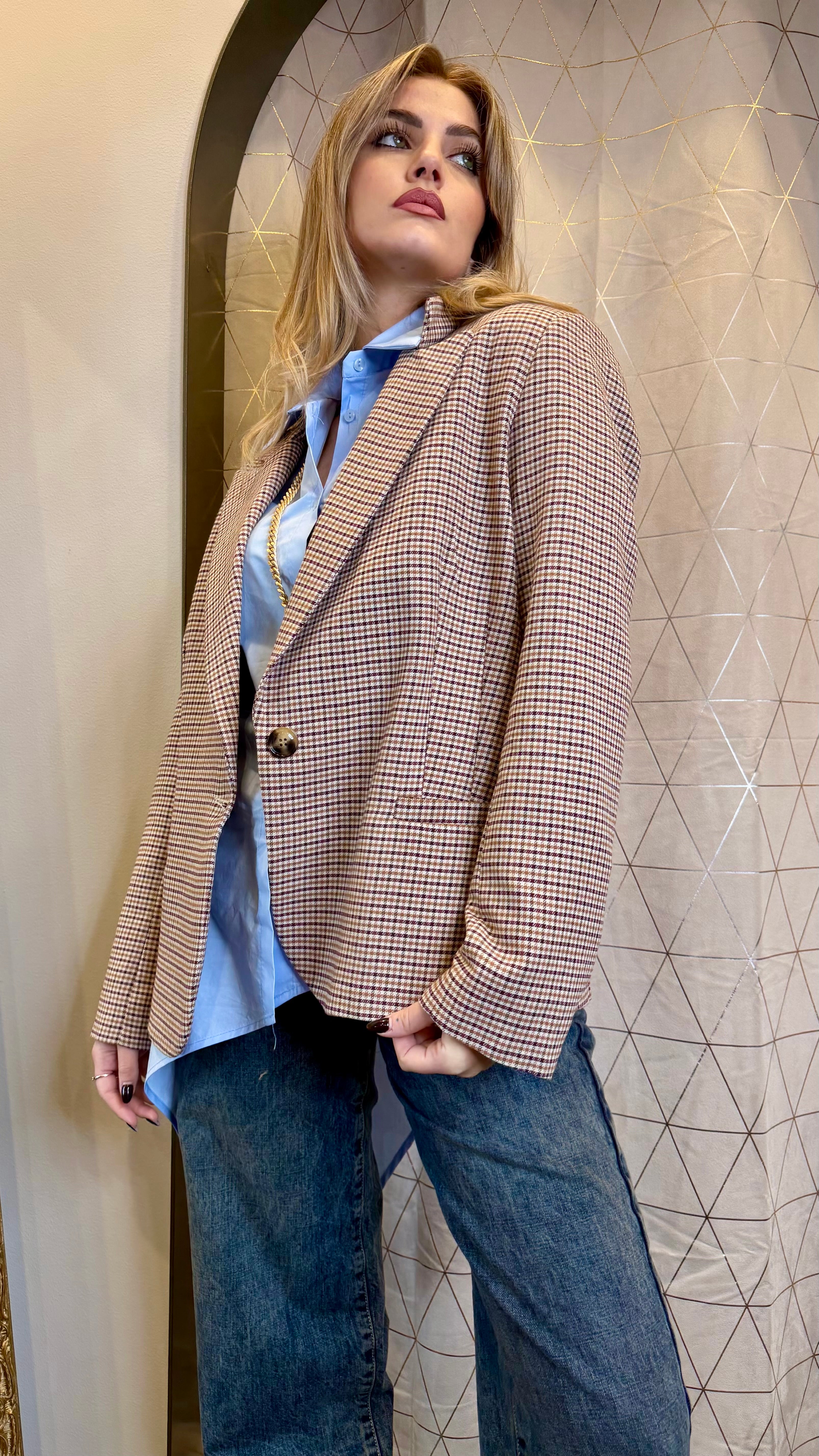 Blazer in fantasia a quadretti monopetto con spalline imbottite