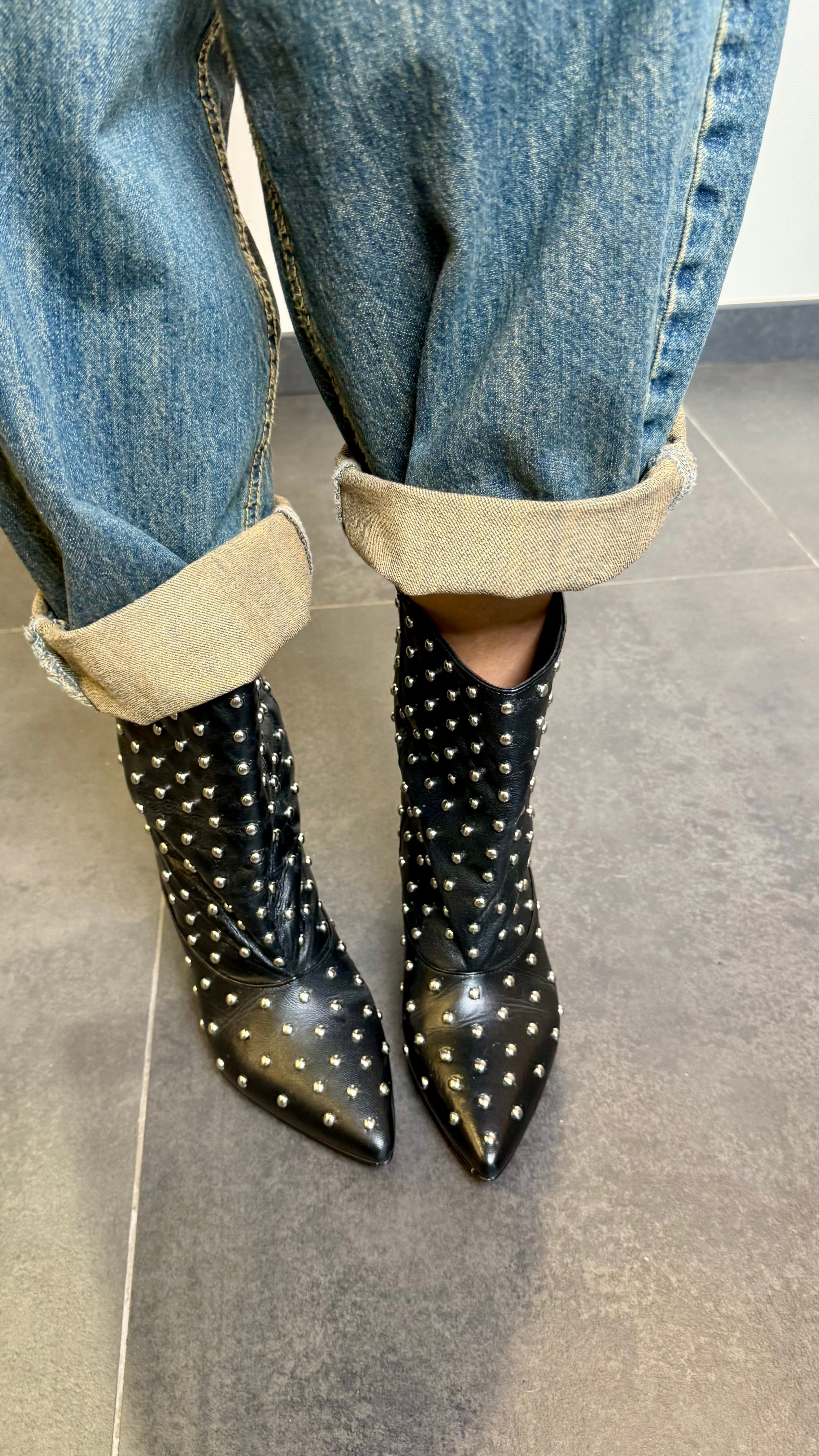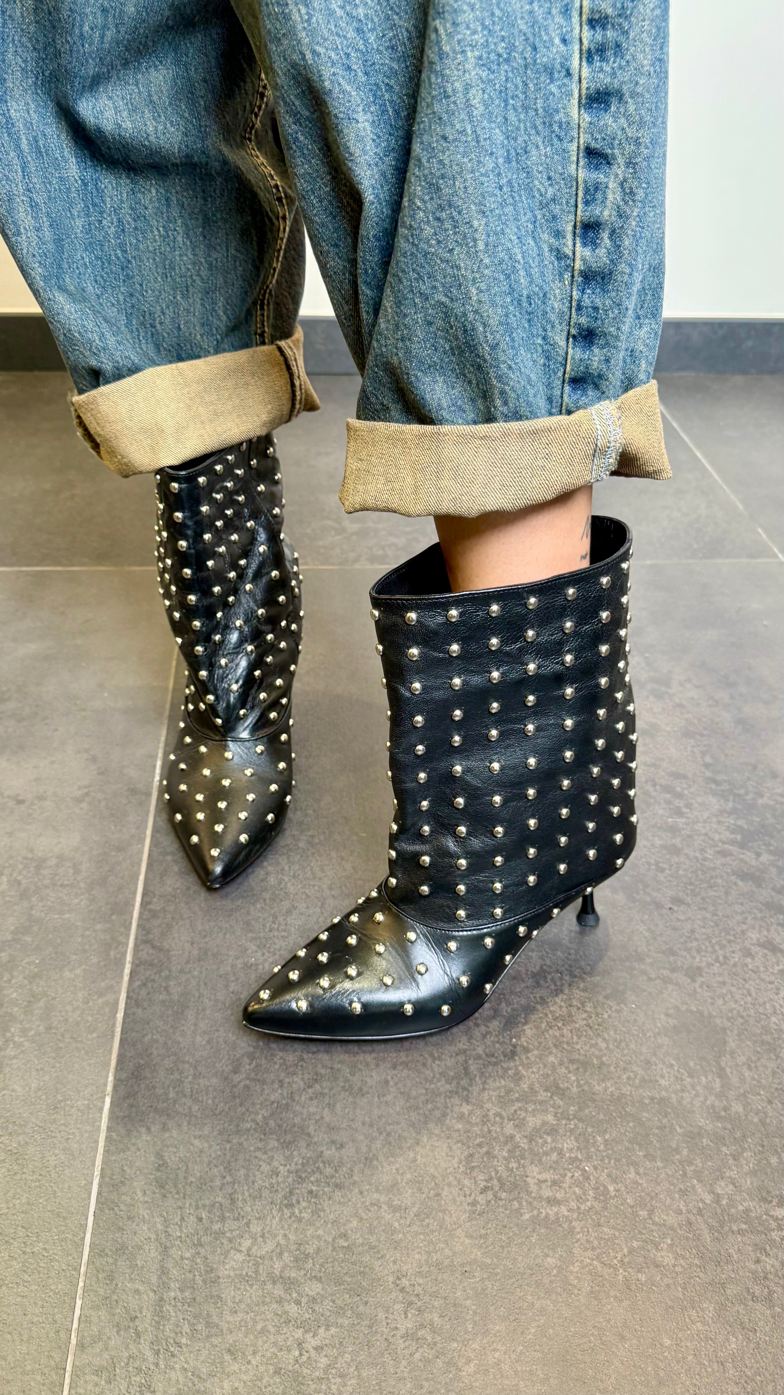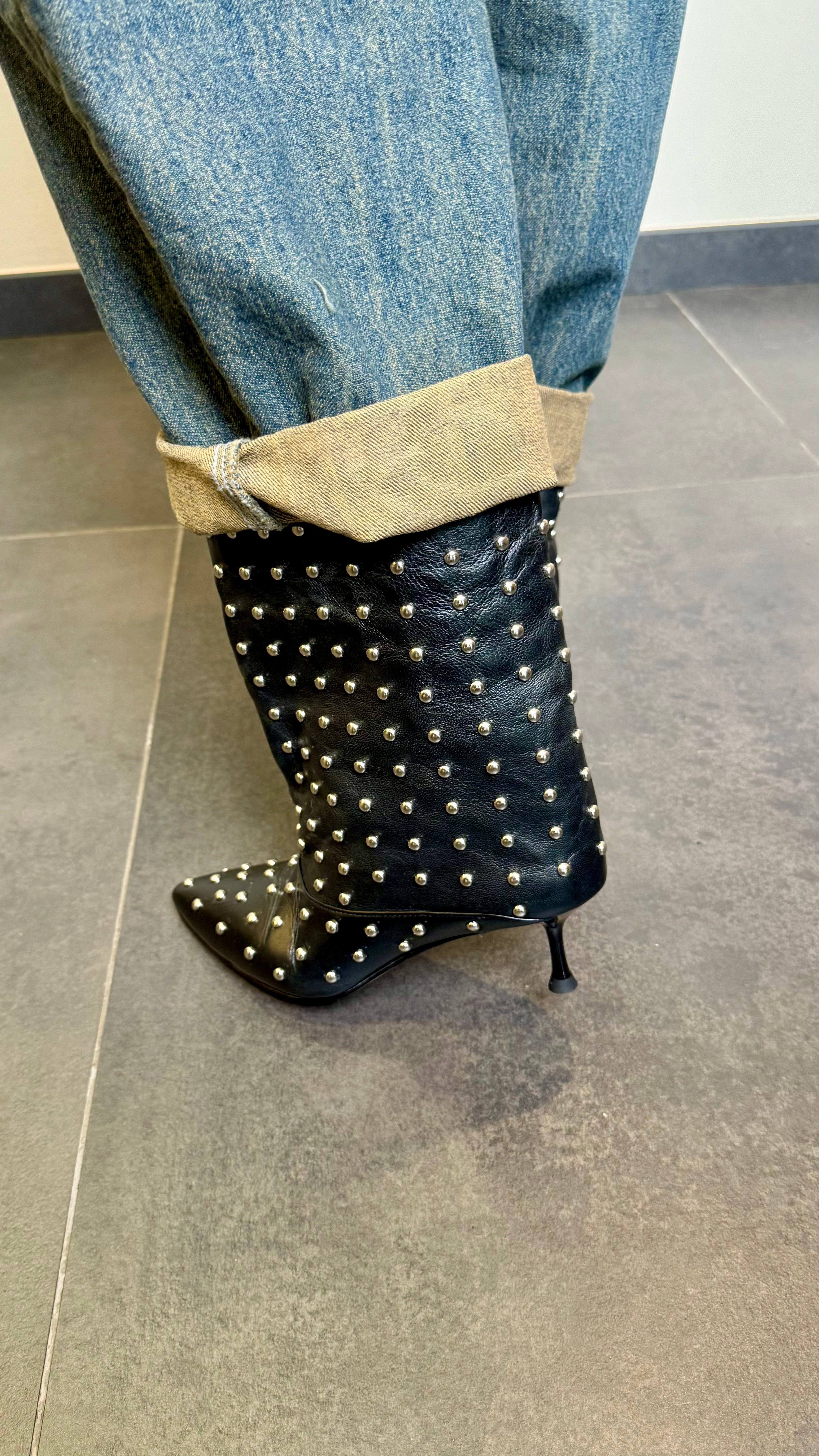 Tronchetto in vera pelle borchiato con tacco basso