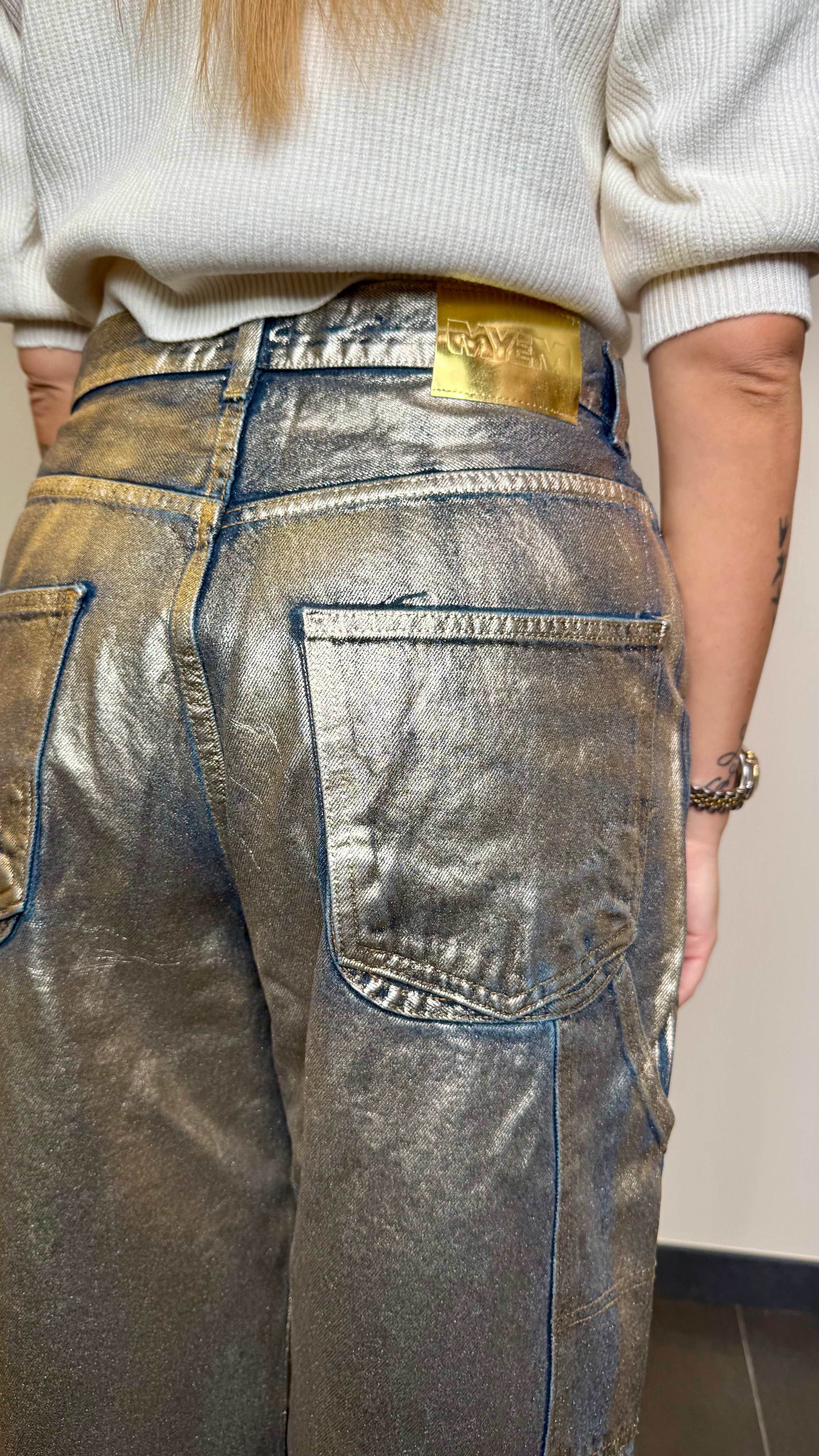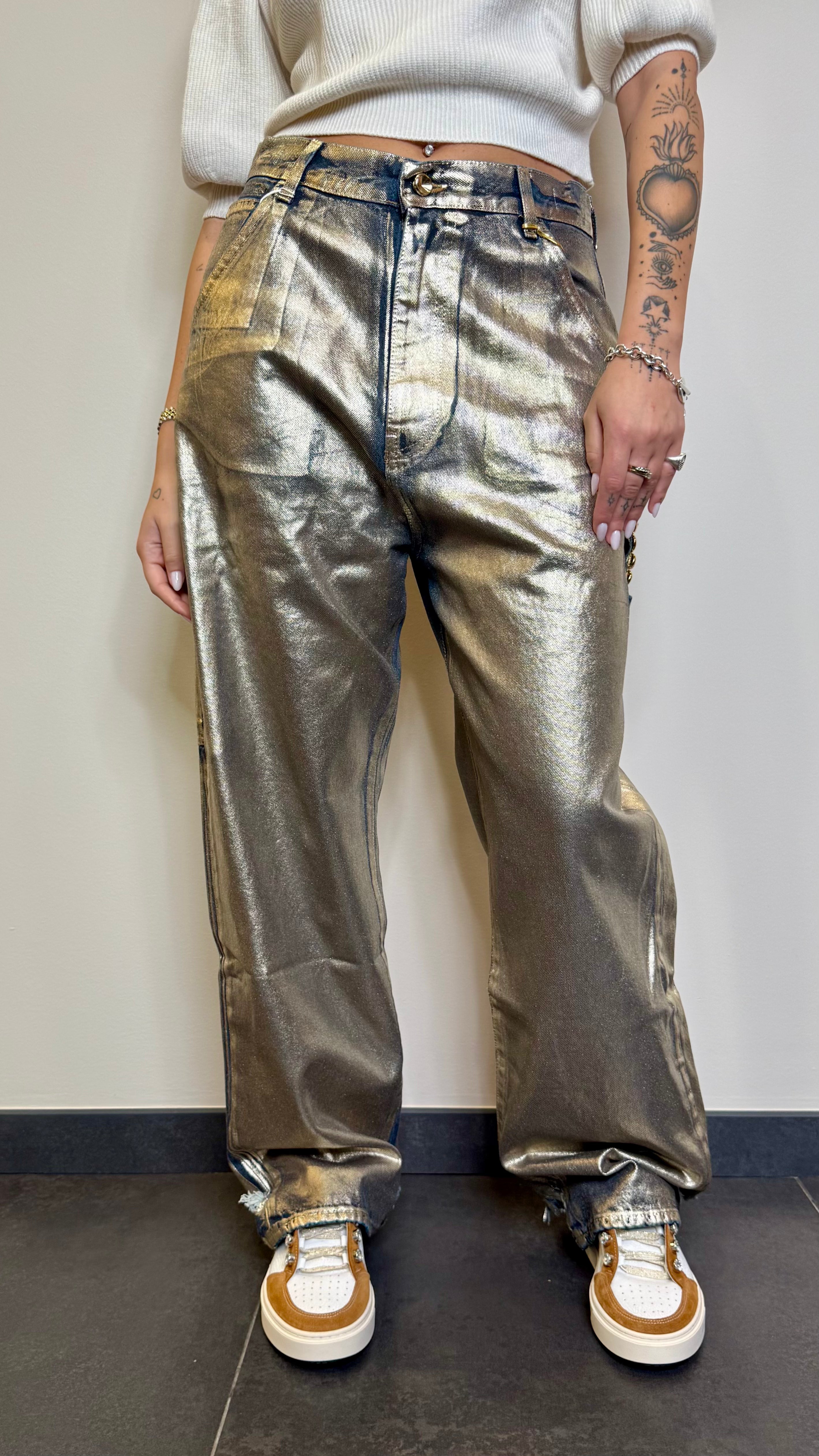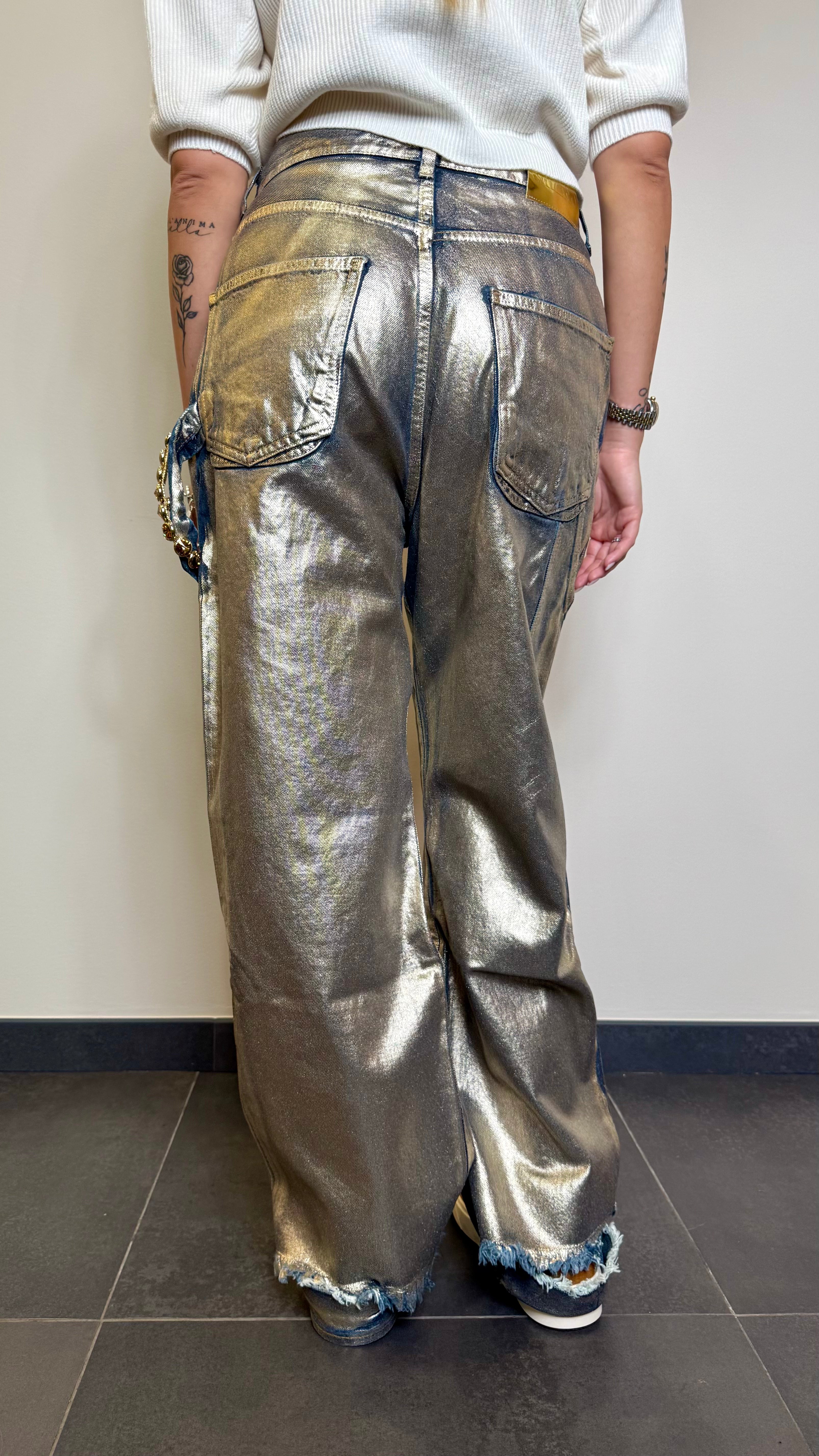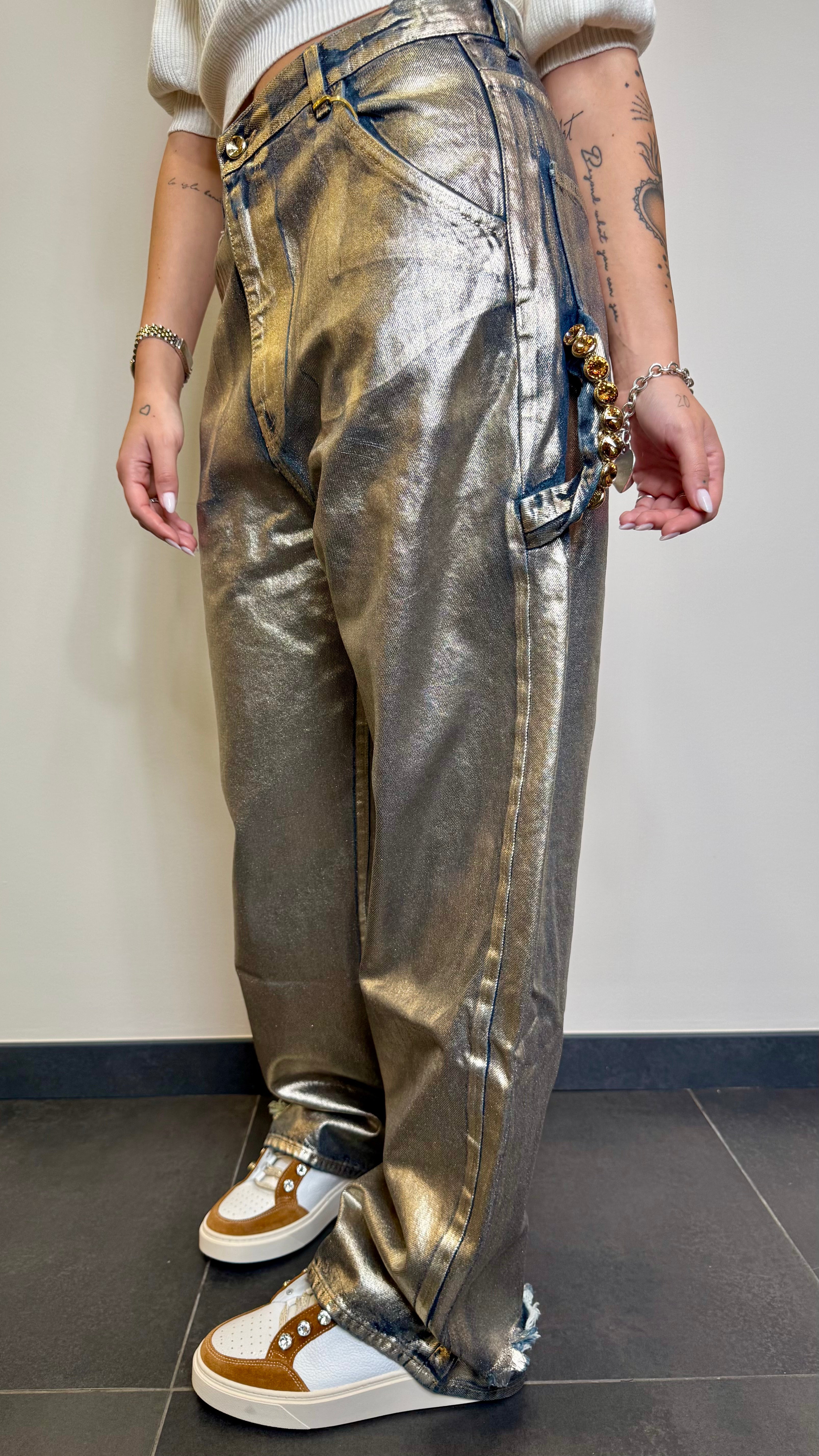 Jeans spalmato oro con dettaglio strass e strappi sul fondo