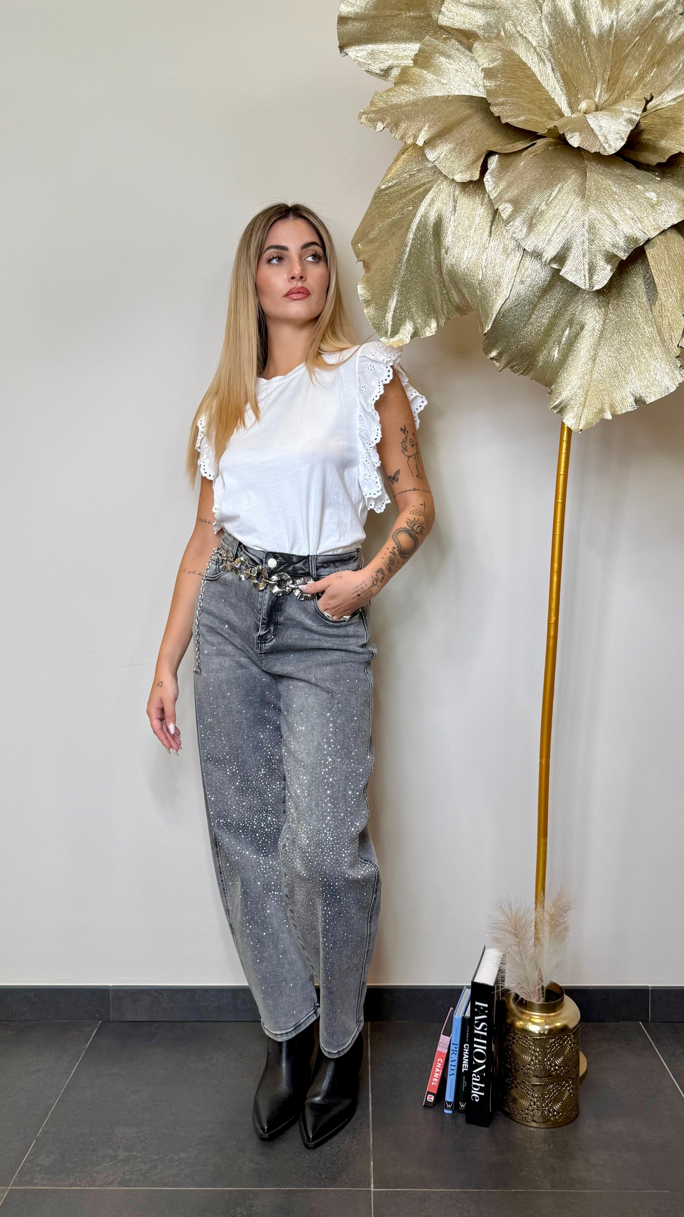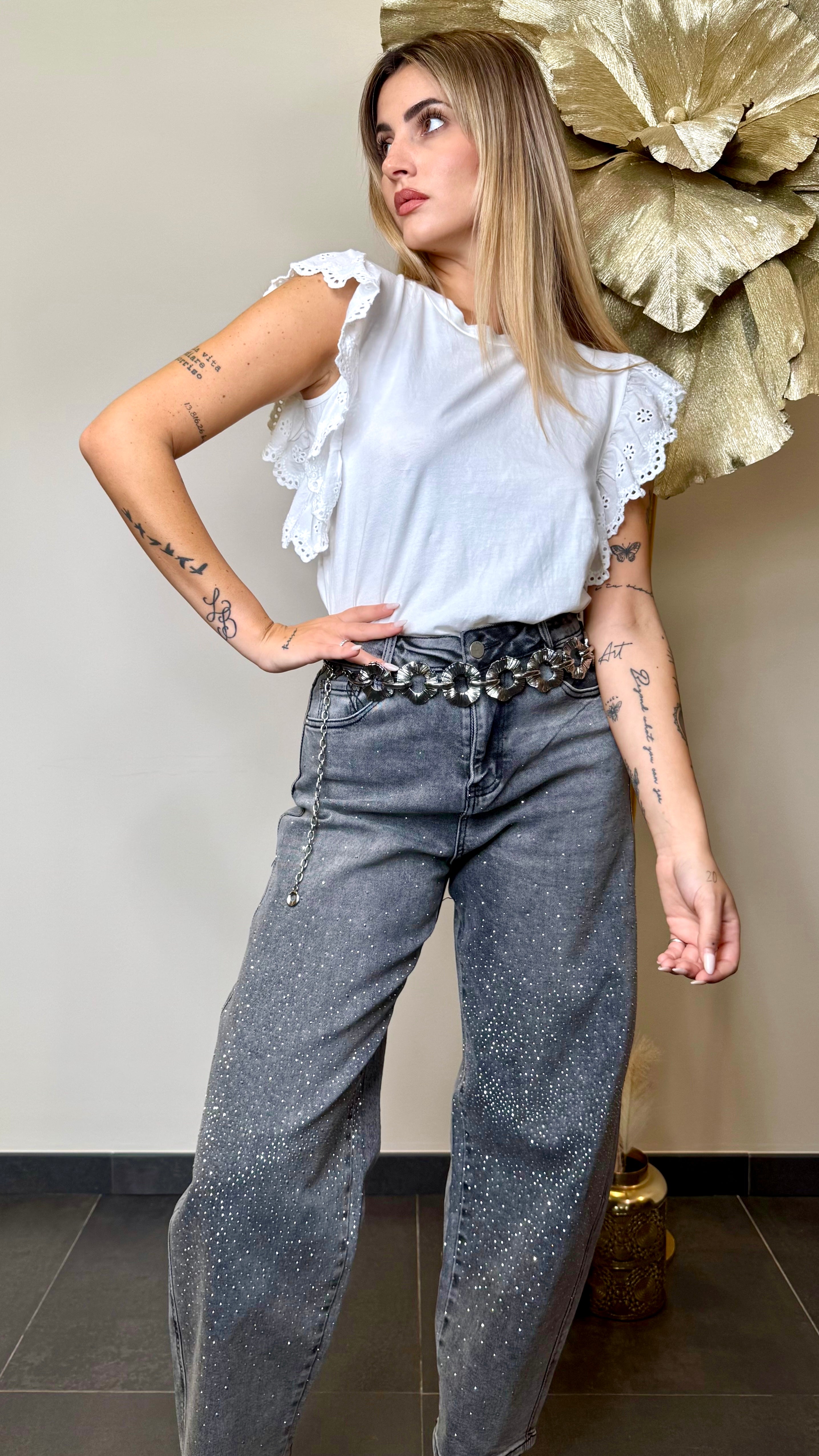 Jeans elasticizzato a ferro di cavallo con strass