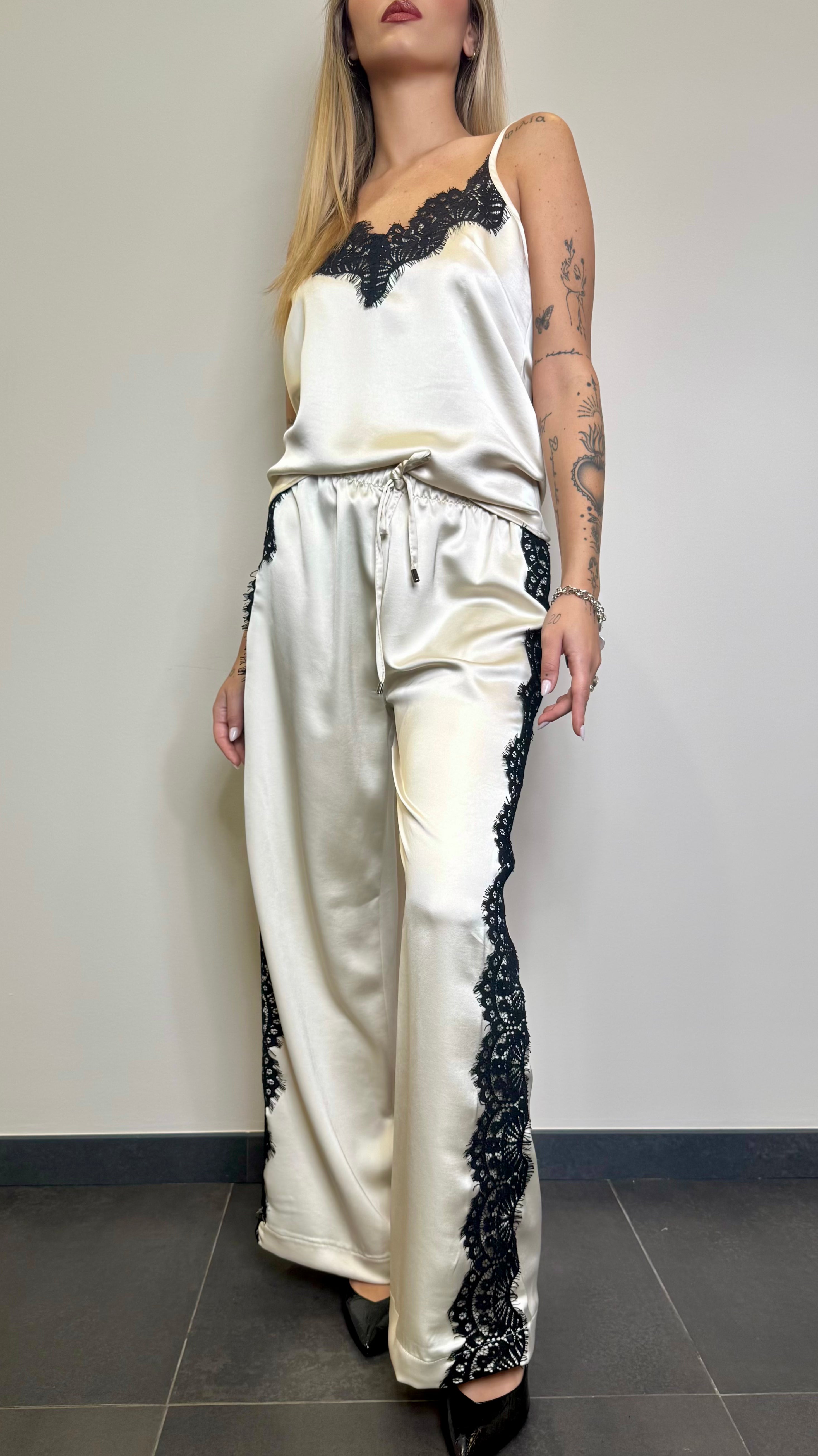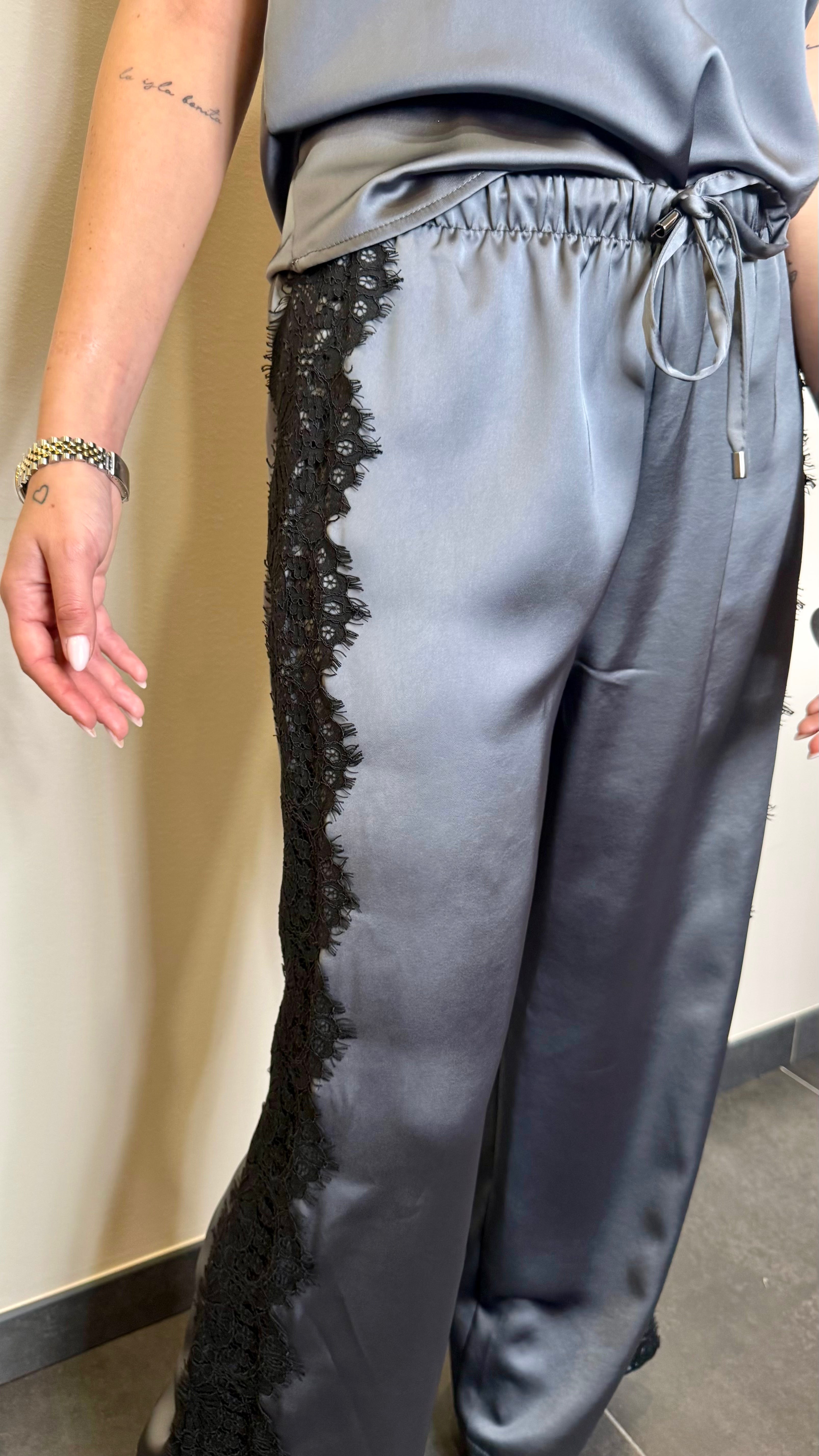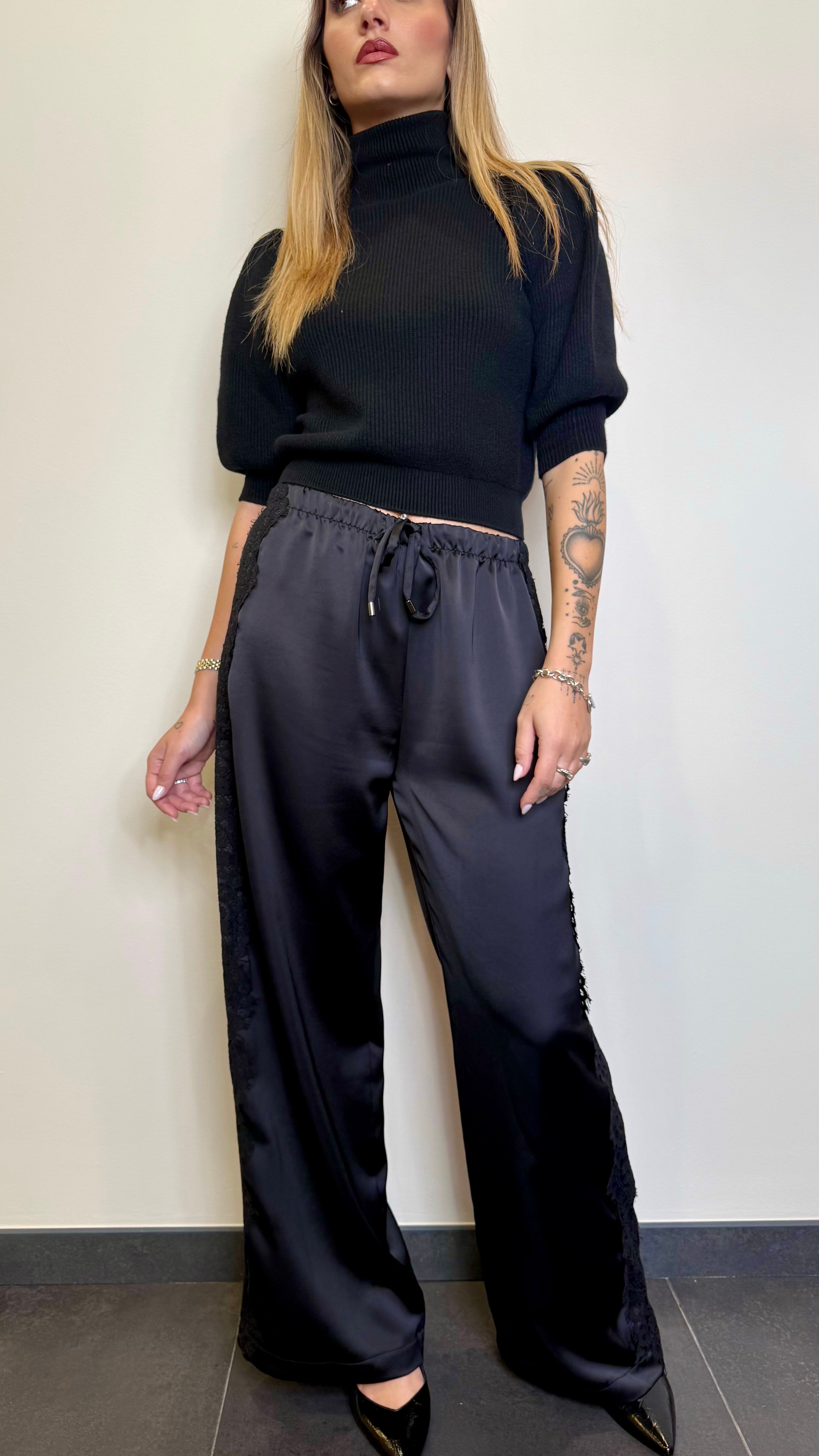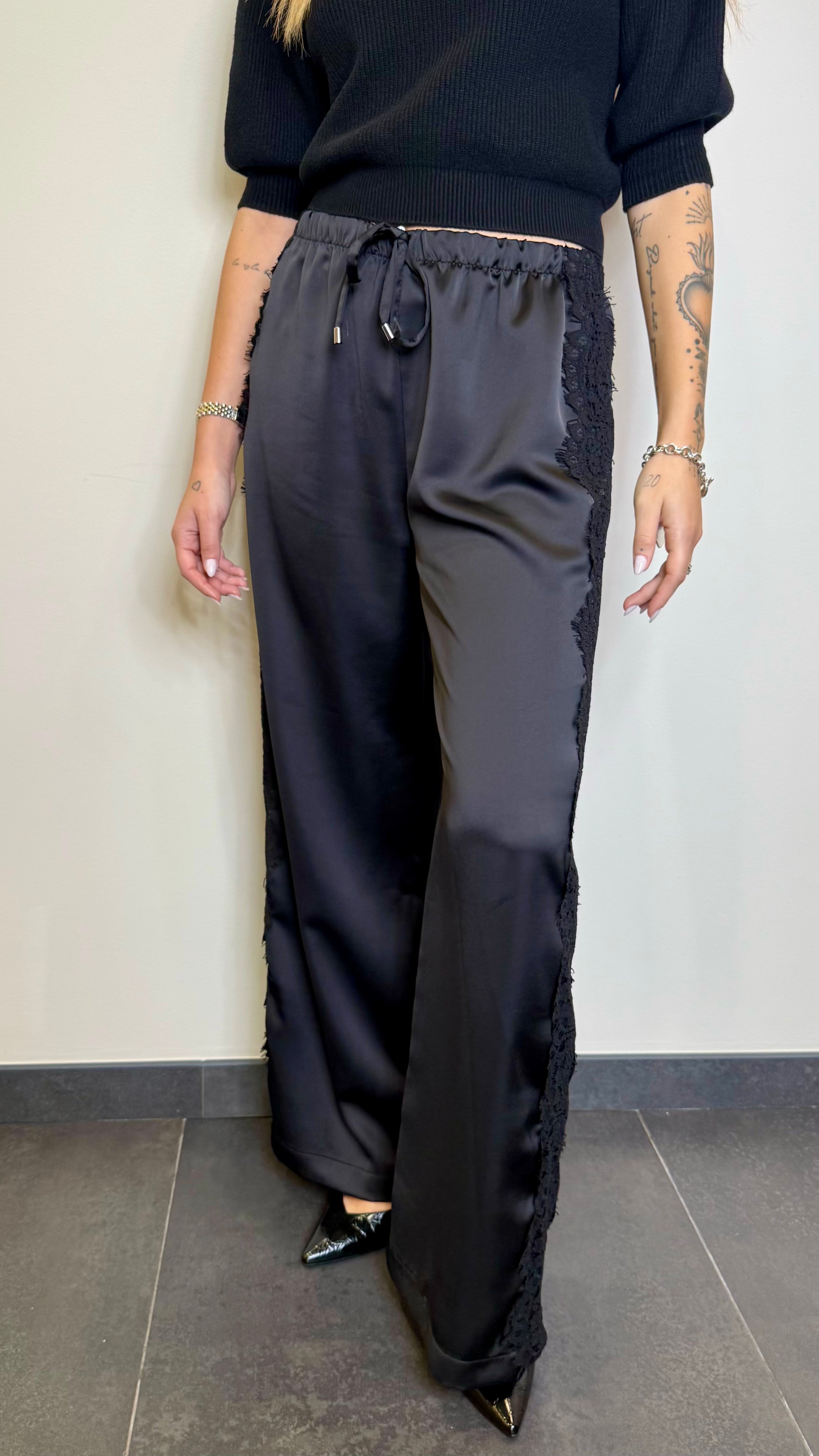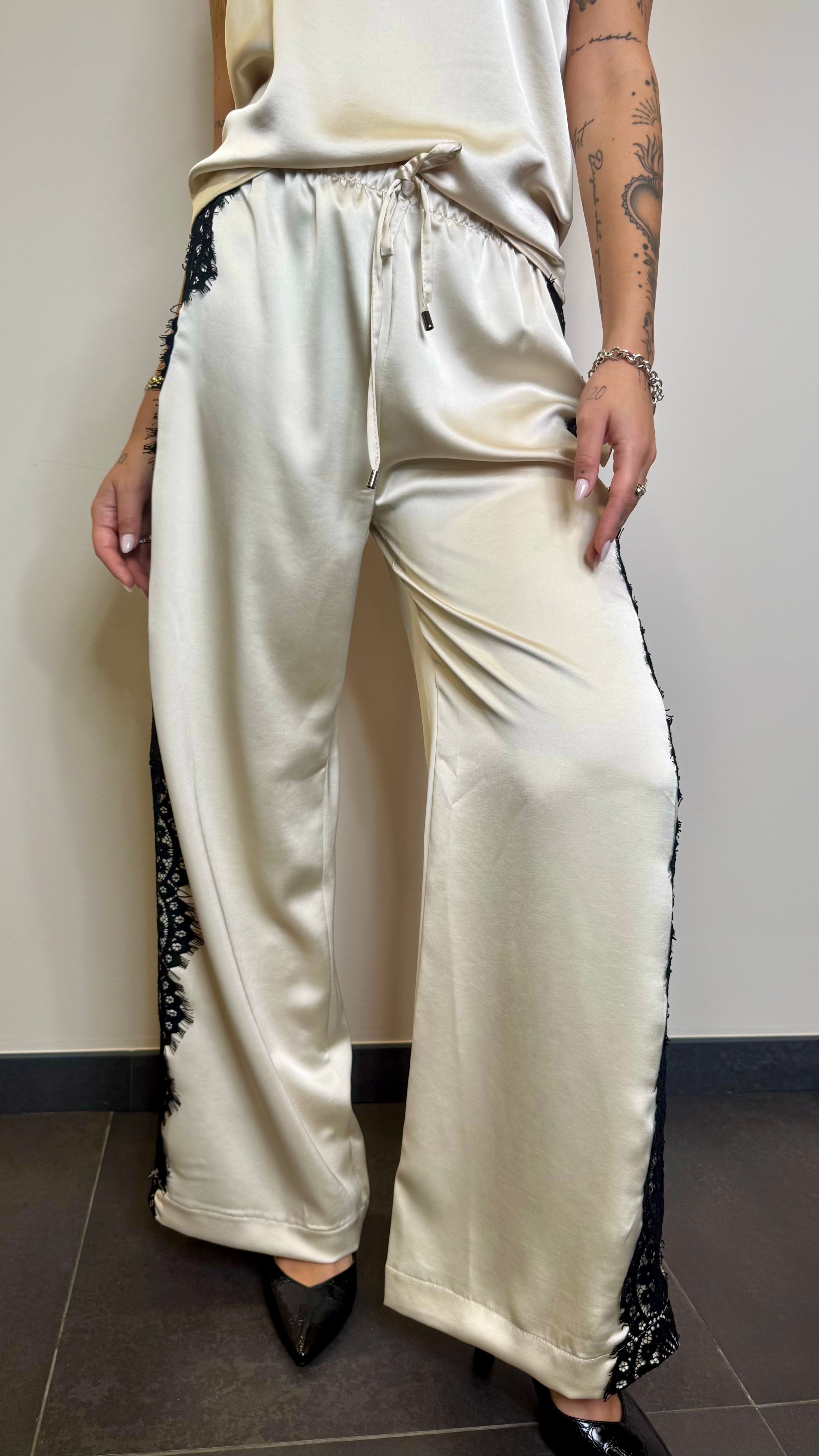 Pantalone in satin con culisse e pizzo
