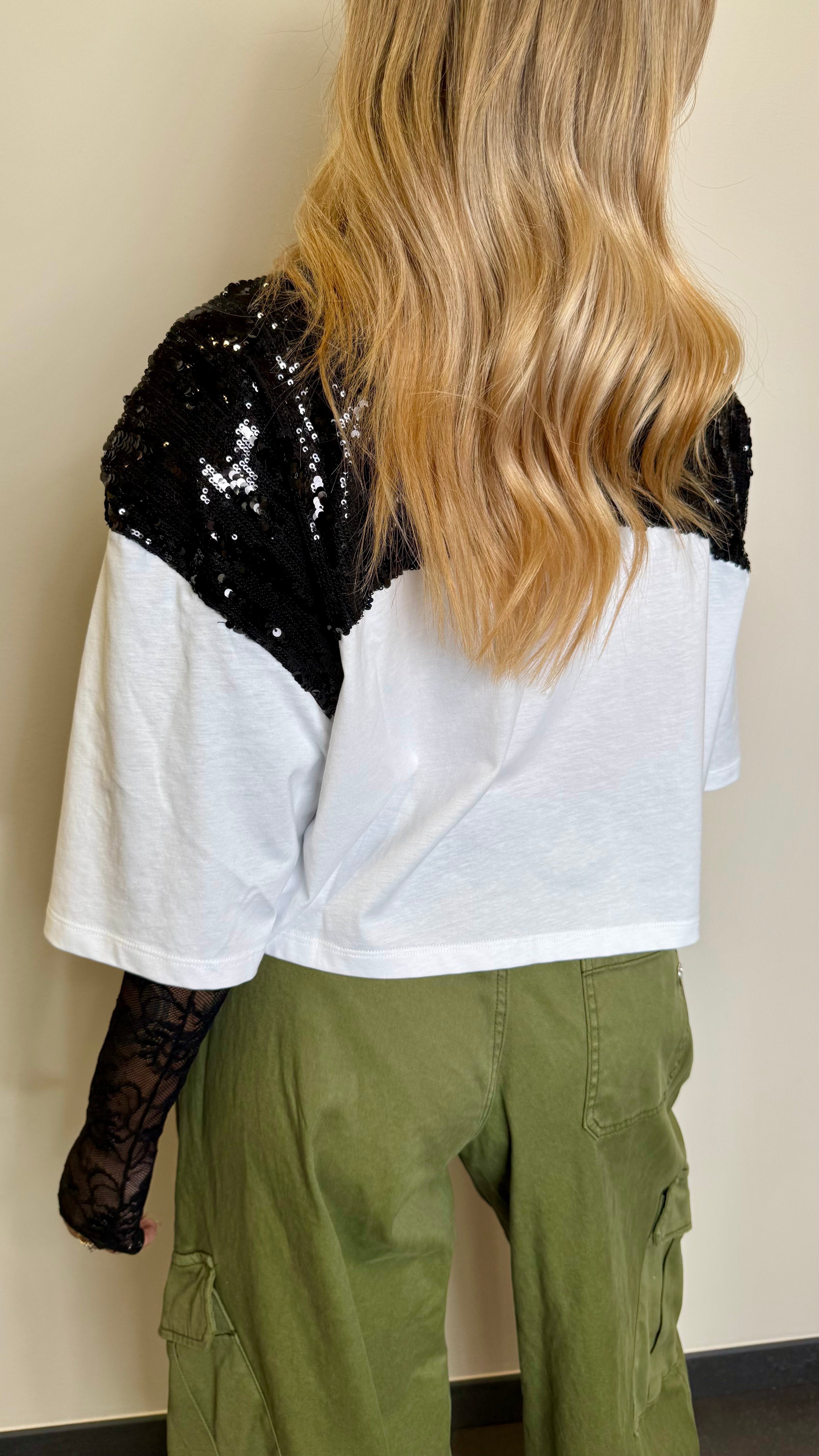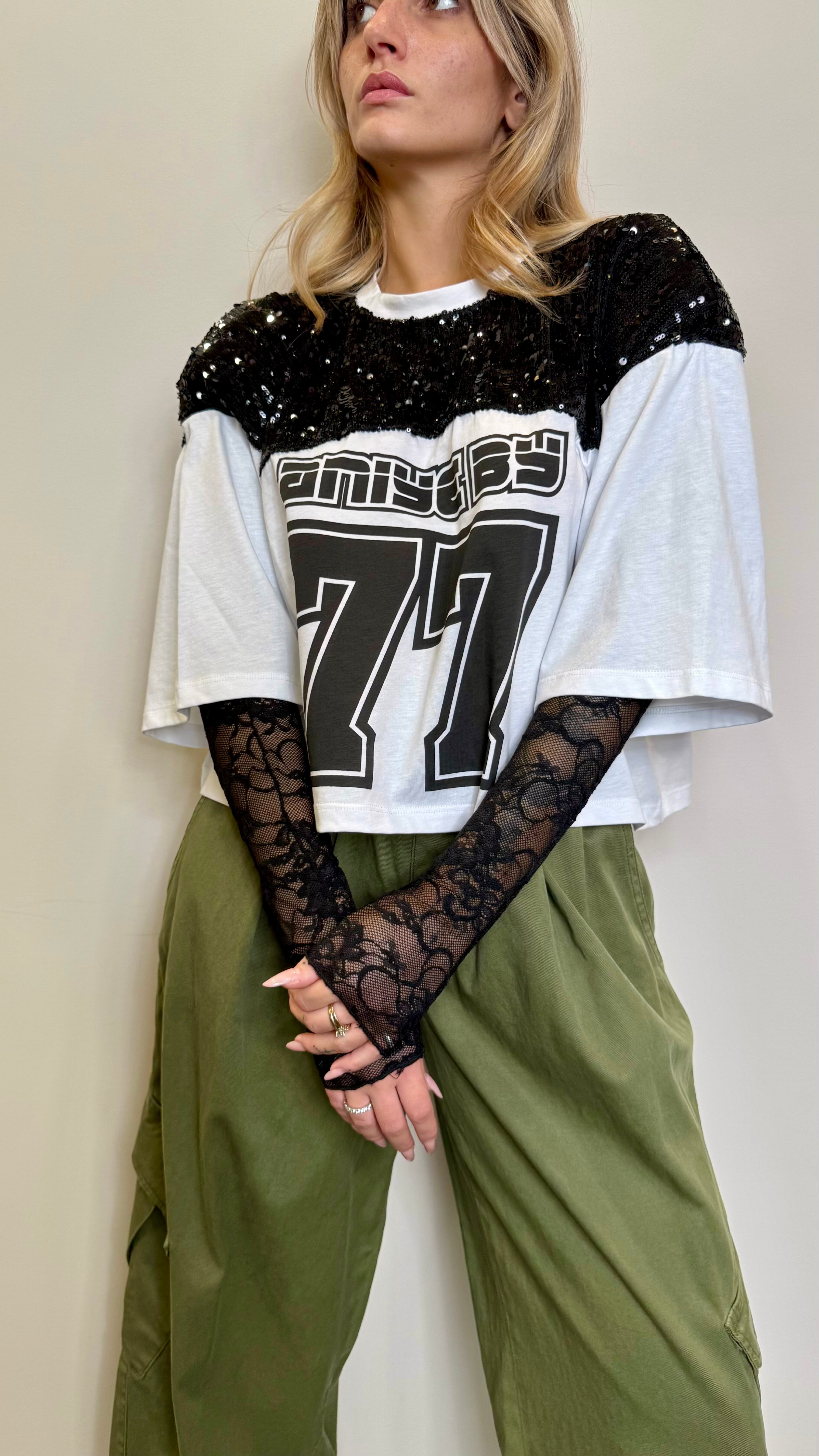 Maglia crop con paillettes e maniche in pizzo e spalline imbottite