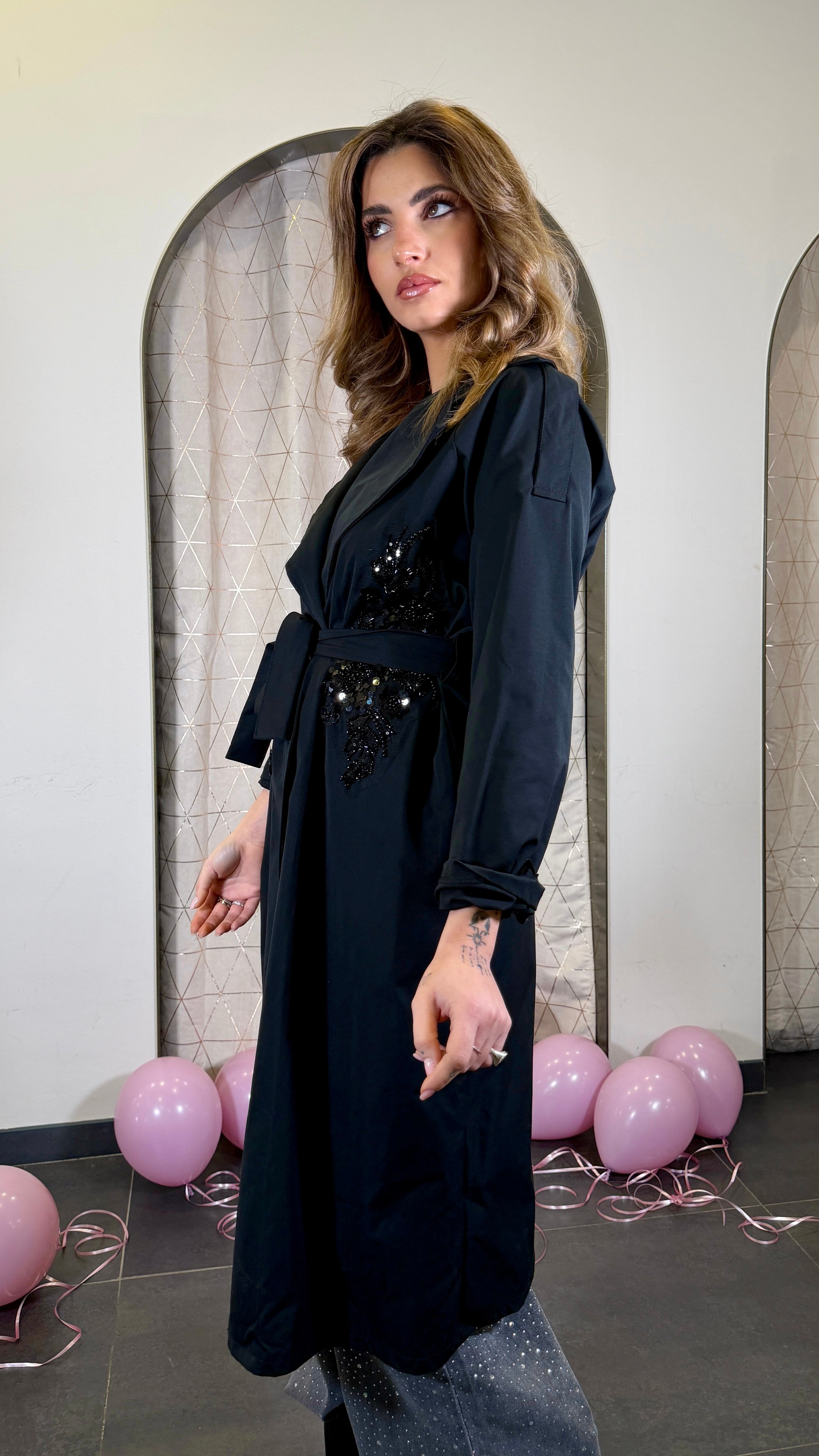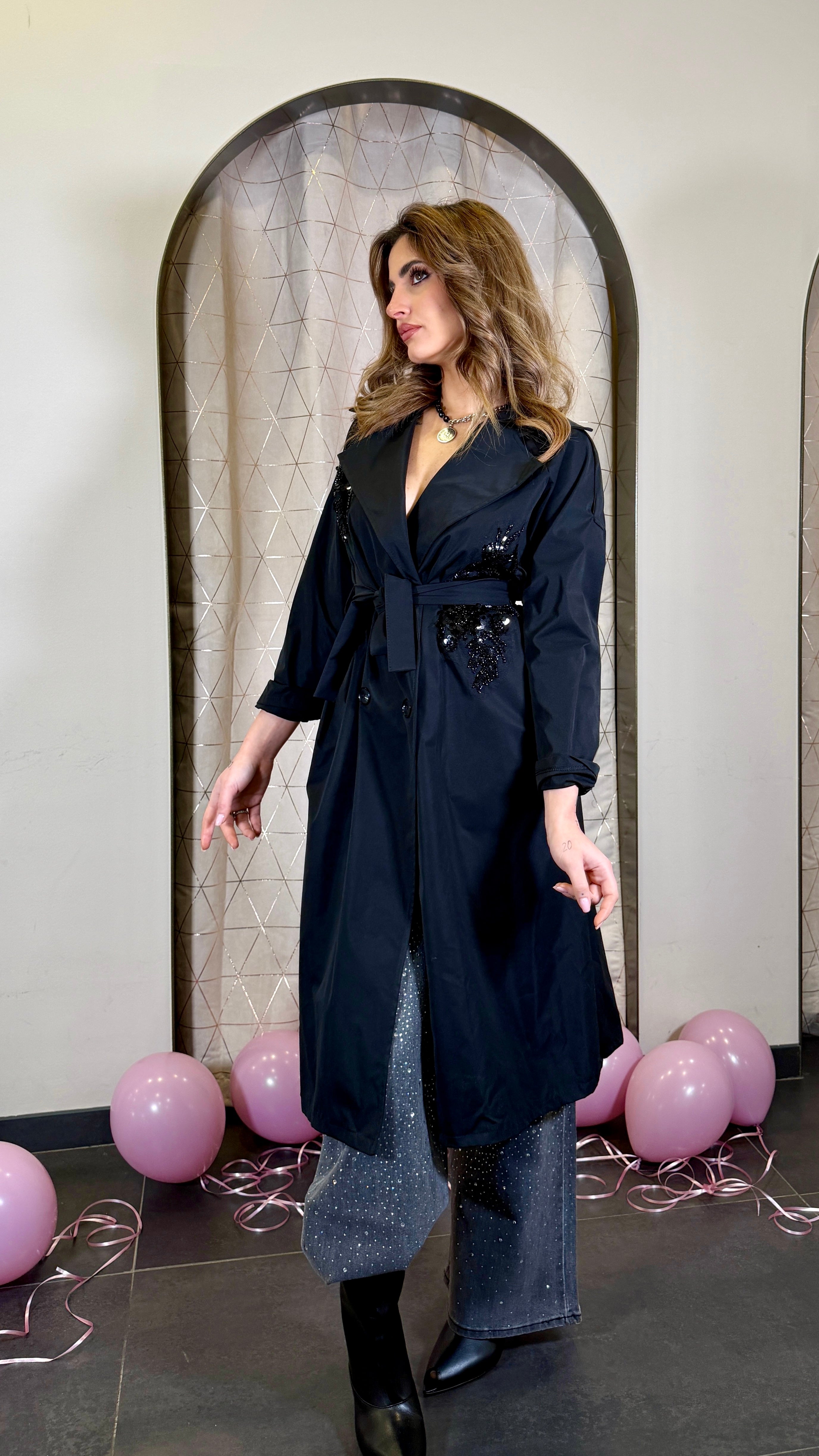 Trench con applicazione in paillettes cucito a mano